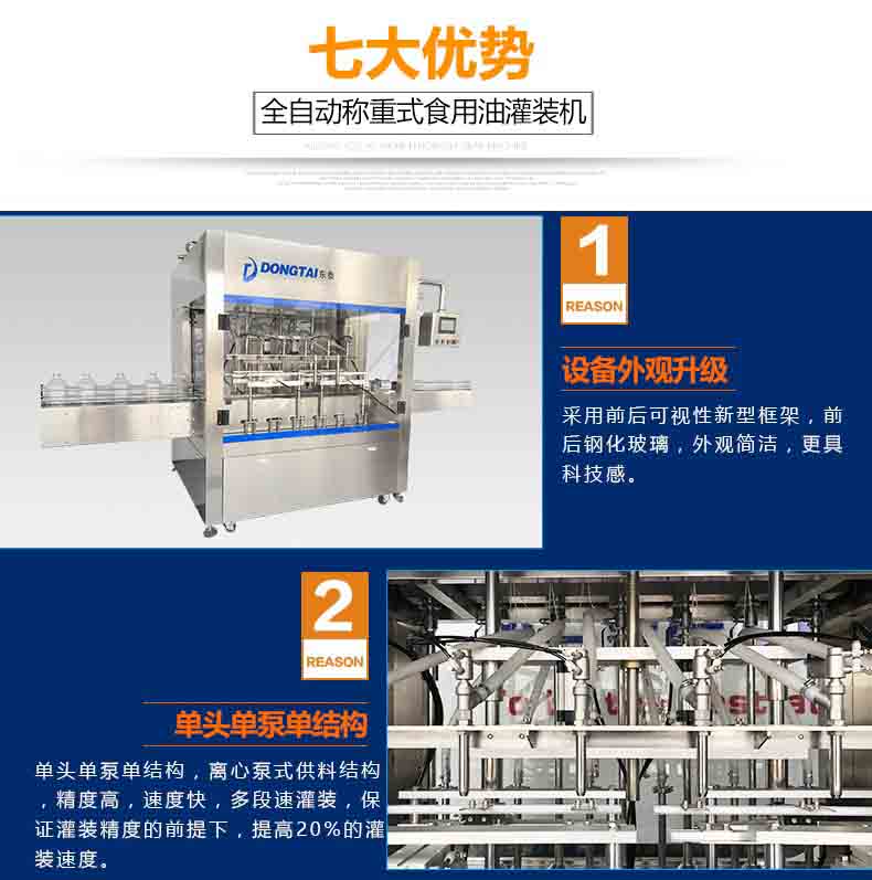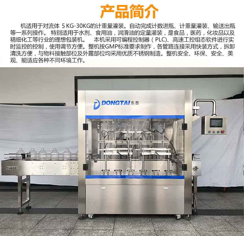 本機適用於對流體5kg-30kg的計重(chóng)量(liàng)灌裝(zhuāng)。自動完成計數進瓶、計重量(liàng)灌裝(zhuāng)、輸送出瓶等一係列操作。 特別適用於水劑、食用(yòng)油,潤滑油的定(dìng)量灌裝,是食品,醫藥,化妝品以及精細化工等行業的包(bāo)裝機。本機采用可(kě)編程控製(zhì)器(PLC)、高速工控組態(tài)軟件進行實時監(jiān)控的(de)控(kòng)製,使用調節方便。整機按GMP標準要求製作,各管路連(lián)接采用(yòng)快裝方式,拆(chāi)卸清洗方便,與物料接觸部(bù)位及外露部位均(jun1)采用優質不鏽(xiù)鋼製造。整機安全、環保、安全、美觀、能(néng)適應各種不同環境工作。