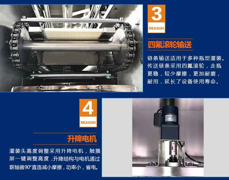 2、鏈條輸送適用於多種瓶型(xíng)灌裝。傳送鏈(liàn)條采用四氟滾輪,走瓶更穩,較少摩(mó)擦,更加耐磨,耐用,延長(zhǎng)了設備(bèi)使(shǐ)用壽命。增加卡瓶口裝置:方便瓶口小的容器灌裝,灌裝頭和瓶口的定位更準確;采用O型擋板,屏蔽漲緊輪的(de)弊端(采用(yòng)魚眼調節鏈輪的鬆緊(jǐn)度),輸送(sòng)采用四氟滾輪式,容器輸送更平穩,可(kě)正反轉輸送;