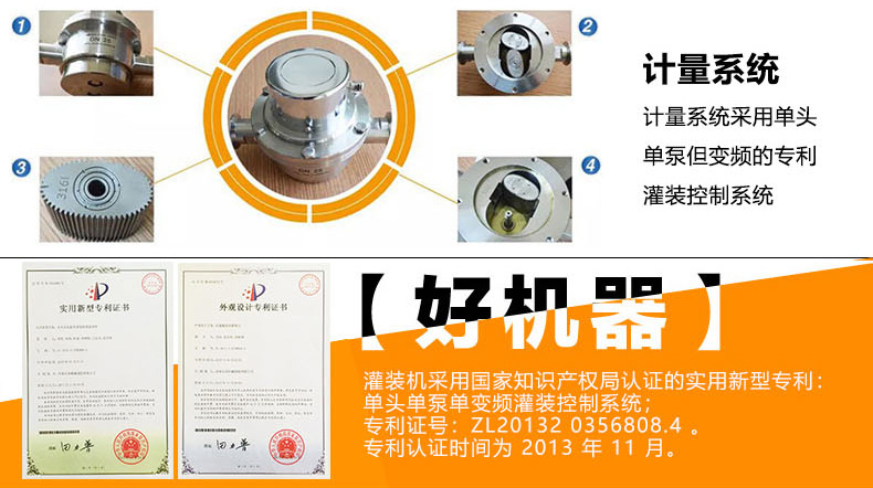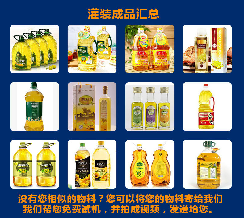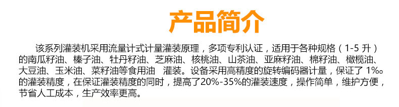 該係列灌裝機采用(yòng)流量計式計量灌裝原理,多項認證(zhèng),適用(yòng)於各種規格(1-5升)的南瓜籽油、榛子油、牡丹籽油、芝麻油、核桃油、山茶油