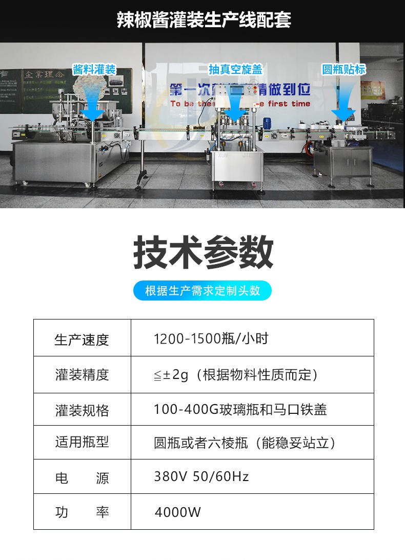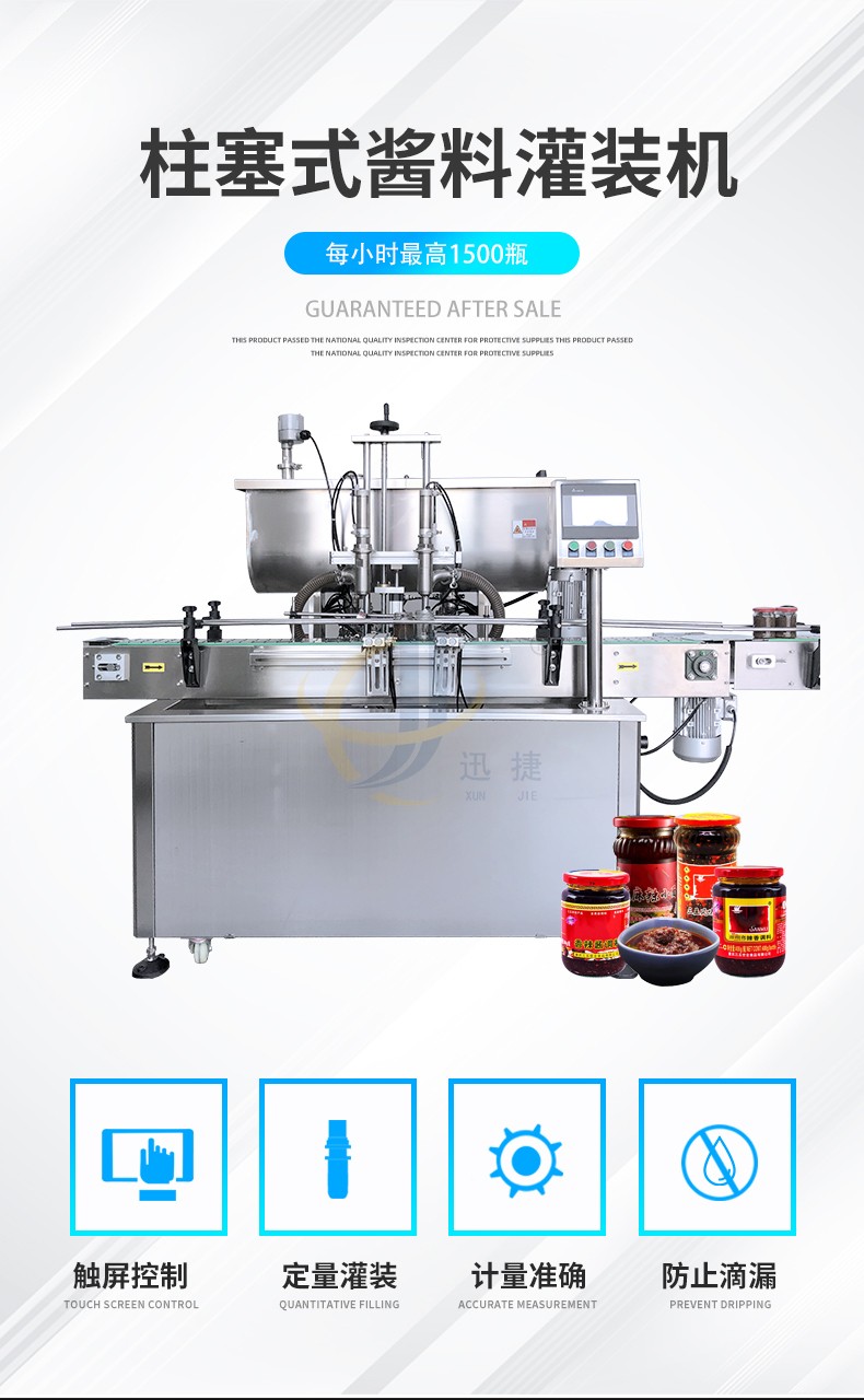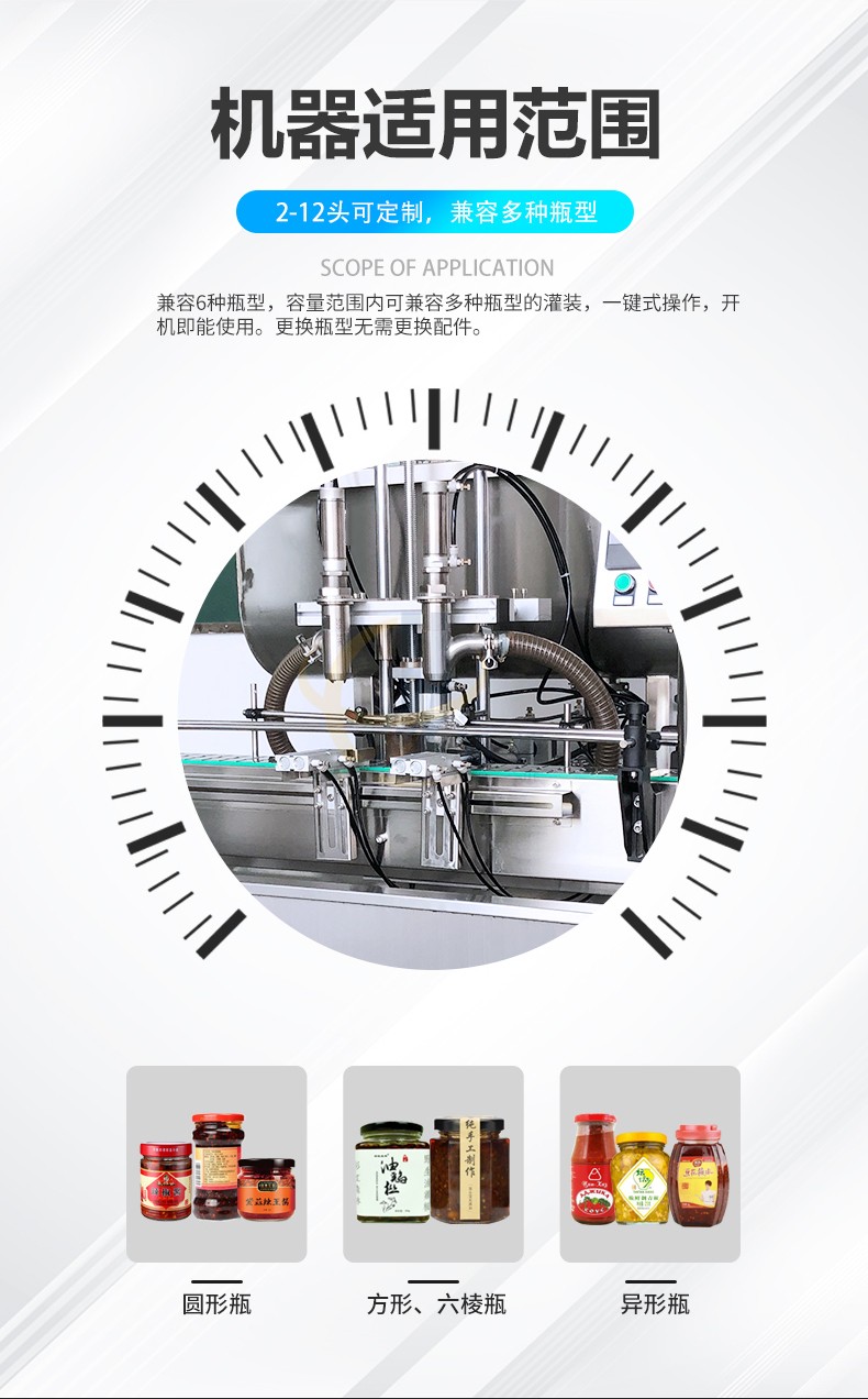 全自(zì)動(dòng)雙頭醬料灌裝機兼容6種瓶(píng)型,容量範(fàn)圍內可兼容多種瓶型的灌(guàn)裝,一鍵式操作,開機即能使用。更換瓶型無需更換(huàn)配件。