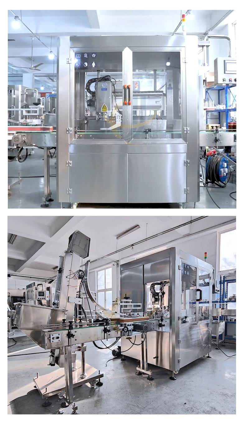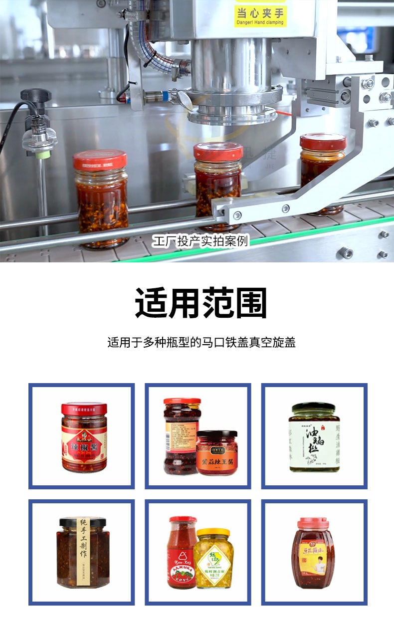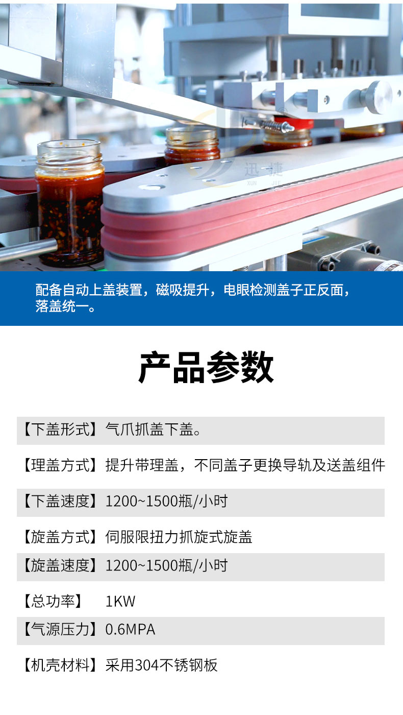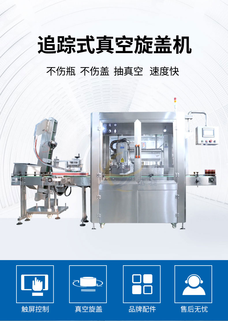 跟蹤式(shì)真空旋蓋機適用於多種瓶型的馬口鐵蓋真(zhēn)空旋蓋。設備由PLC結合觸摸屏控製,采用世界知名品牌電器和氣動元件,故障率低。