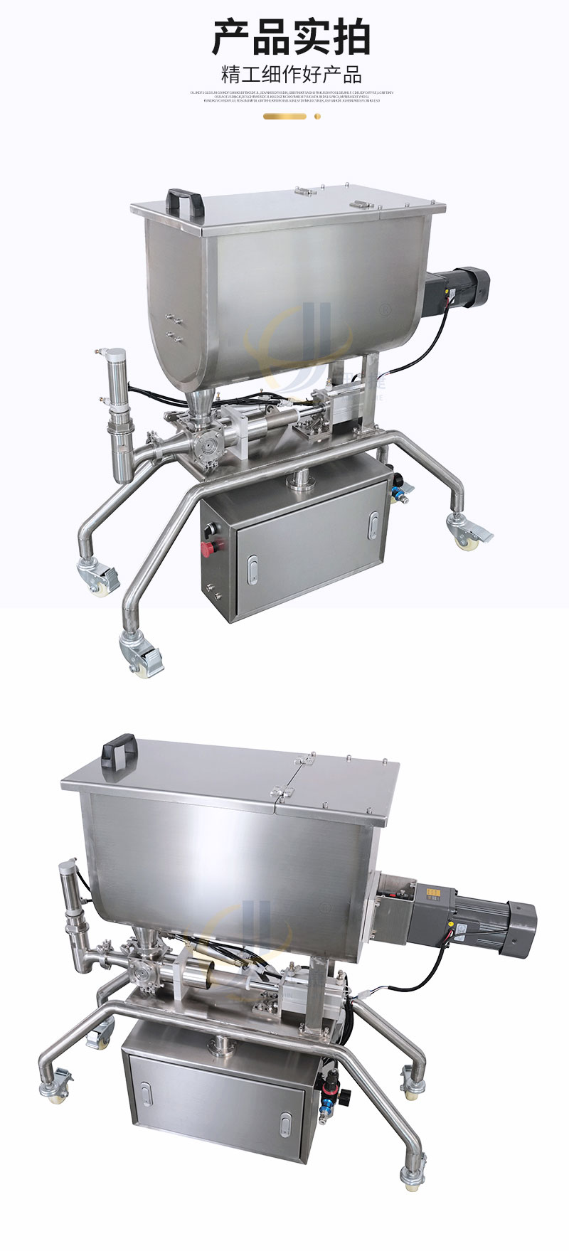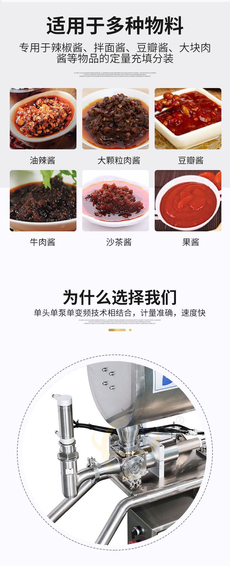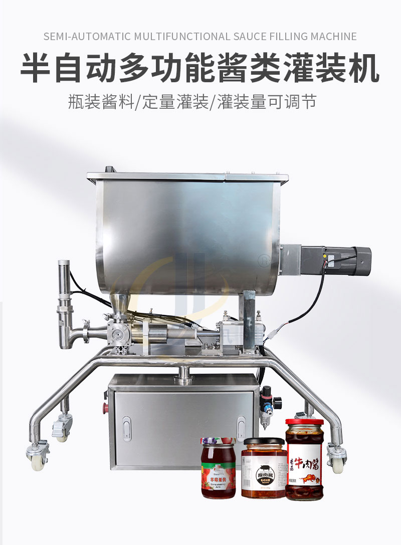 半自動(dòng)醬類灌裝機(jī)適合於將各類粘稠體及含有各種固體(tǐ)物質如辣椒、花(huā)生、肉塊、佐料等物體的醬類和油、料分離的火(huǒ)鍋底料等灌裝於各種容器中