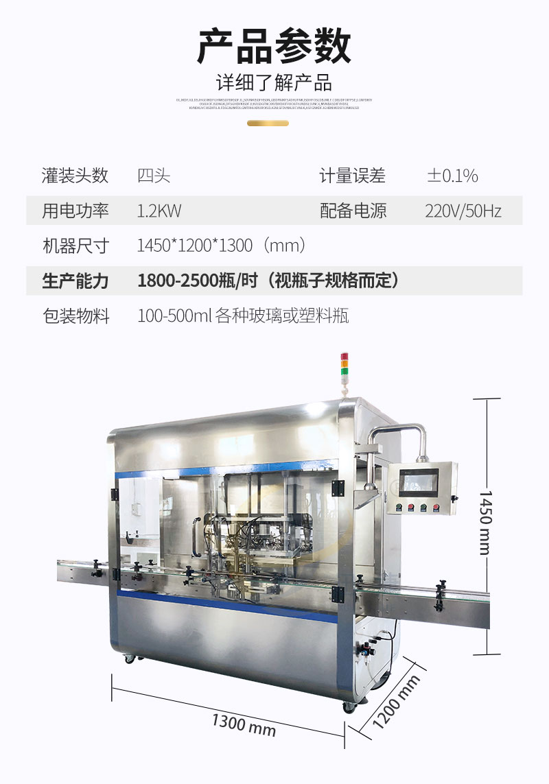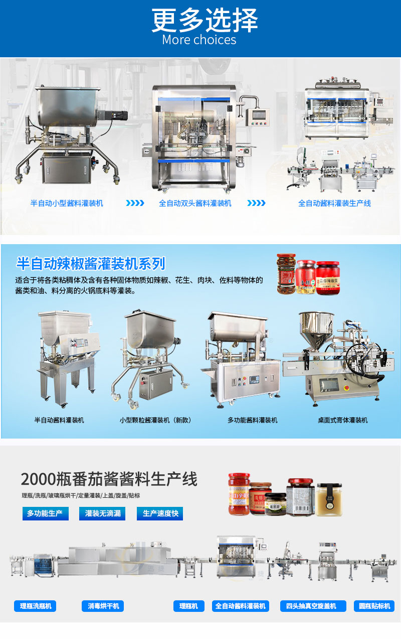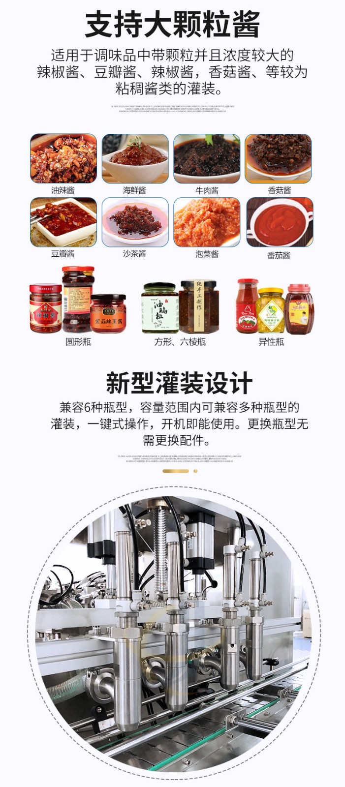 全自動四頭辣(là)椒醬灌裝機適合中小口徑三旋、四(sì)旋玻璃瓶調味醬的分裝,適合醬料、含顆粒黏稠物料的灌裝,物料接觸部分(fèn)均(jun1)采用