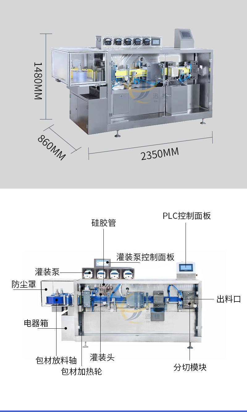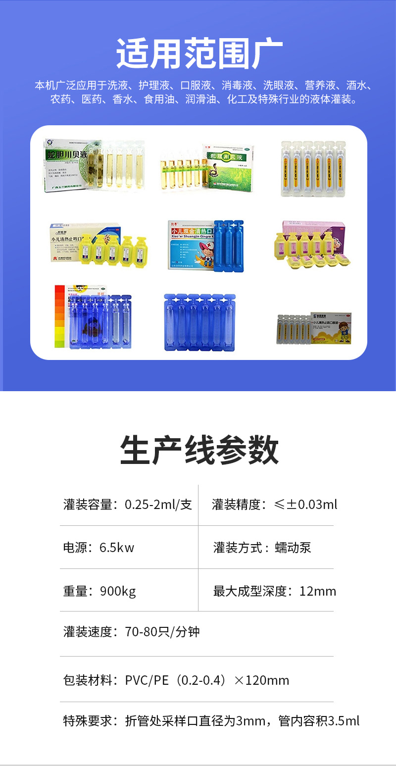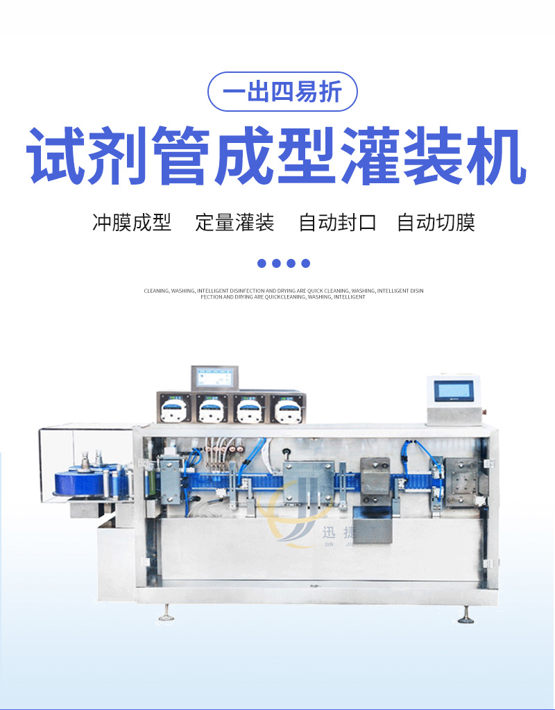 易折試劑管成型灌裝(zhuāng)機(jī)廣泛使用於護理液、口(kǒu)服液、洗眼液、營養液、香水、食用油、潤滑油、化工及特殊行業的液體灌裝。