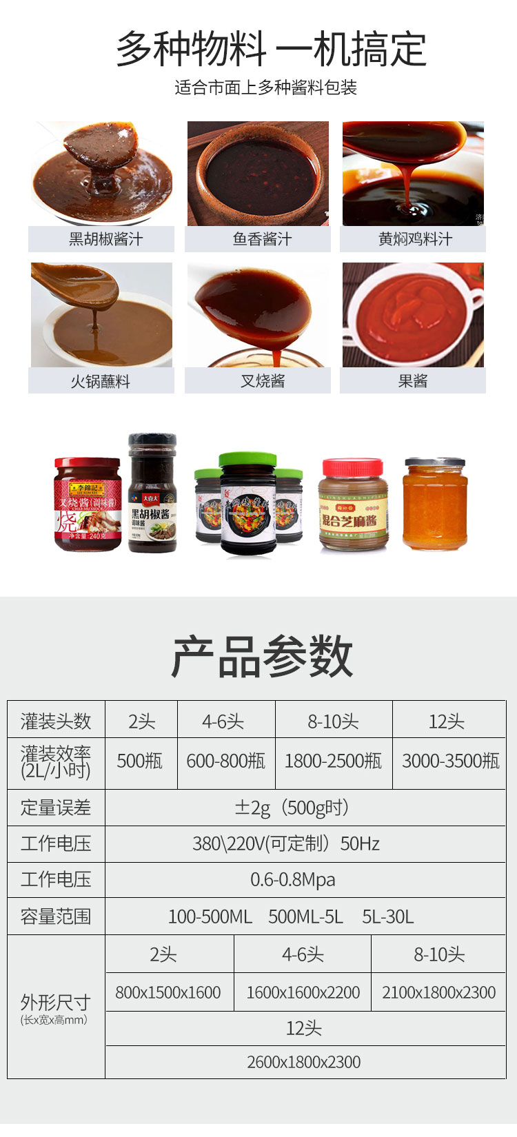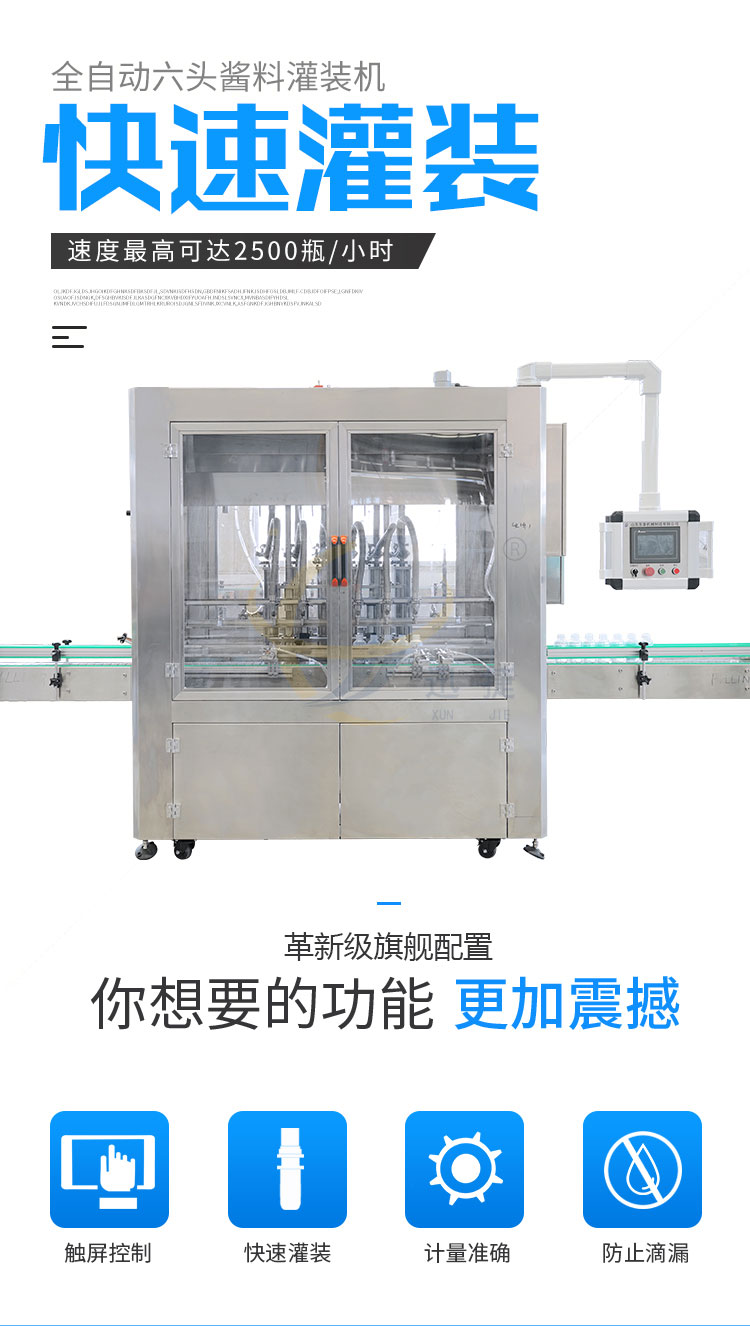 全自動醬汁灌裝機(jī)可(kě)實時根據不同產品做出不同的調整,操作方便,內置各種(zhǒng)配(pèi)方一鍵保存(cún)讀(dú)取。傻(shǎ)瓜式操作界麵。