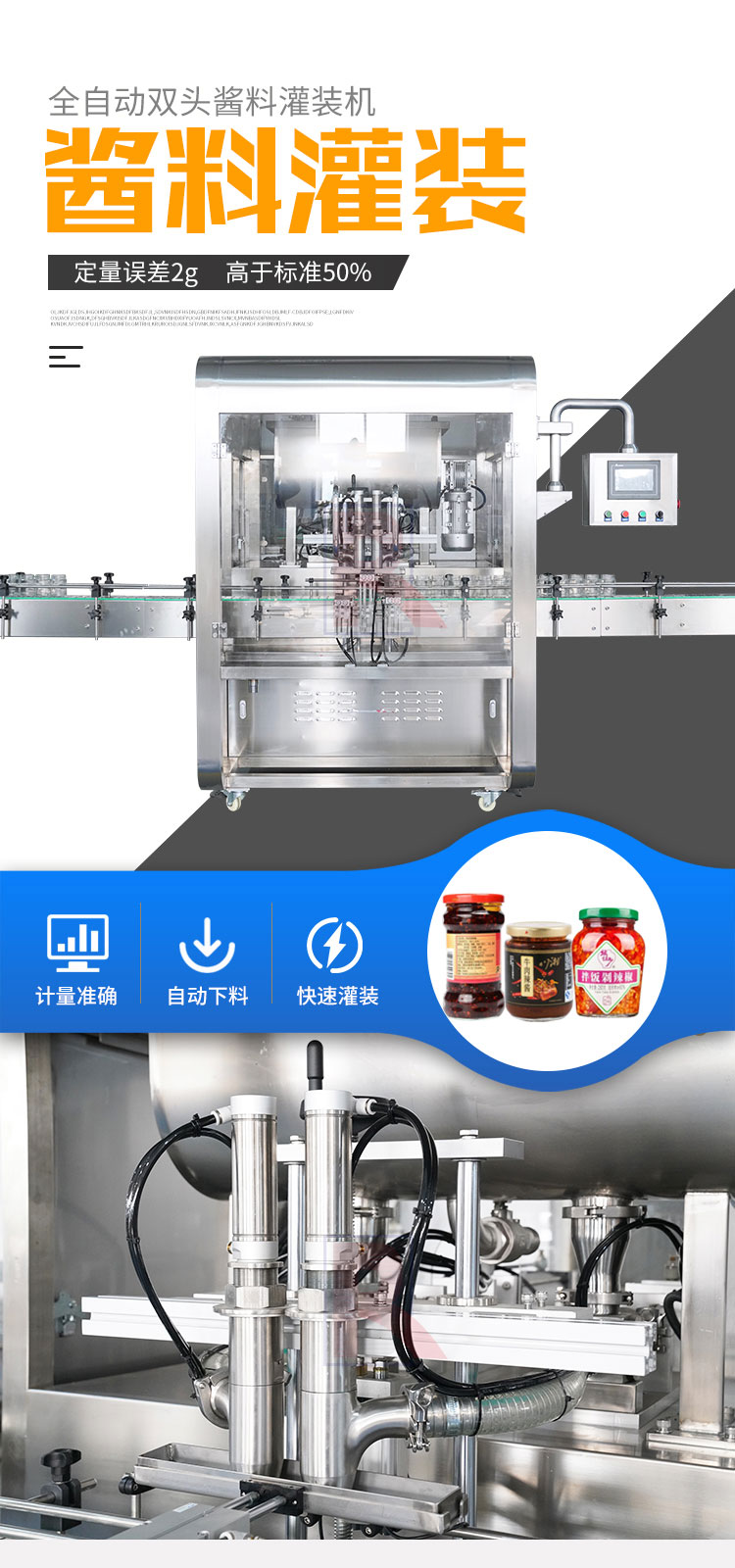 雙頭醬料灌裝機適用於調味品中帶顆粒並且濃度較大的香菇醬、豆瓣醬、花生醬、芝麻醬、果醬、牛(niú)油火鍋底料等醬類的灌裝。
