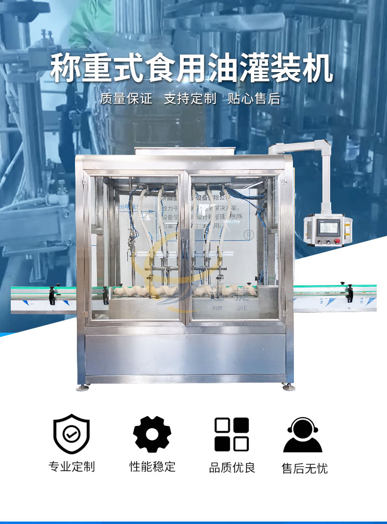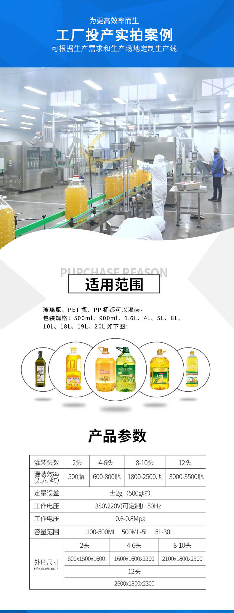 全自動食用油灌裝機適用於玻(bō)璃瓶、PET瓶、PP桶都可以灌(guàn)裝。包(bāo)裝規格:500ml、900ml1.6L、4L、5L、8L、10L、18L。
