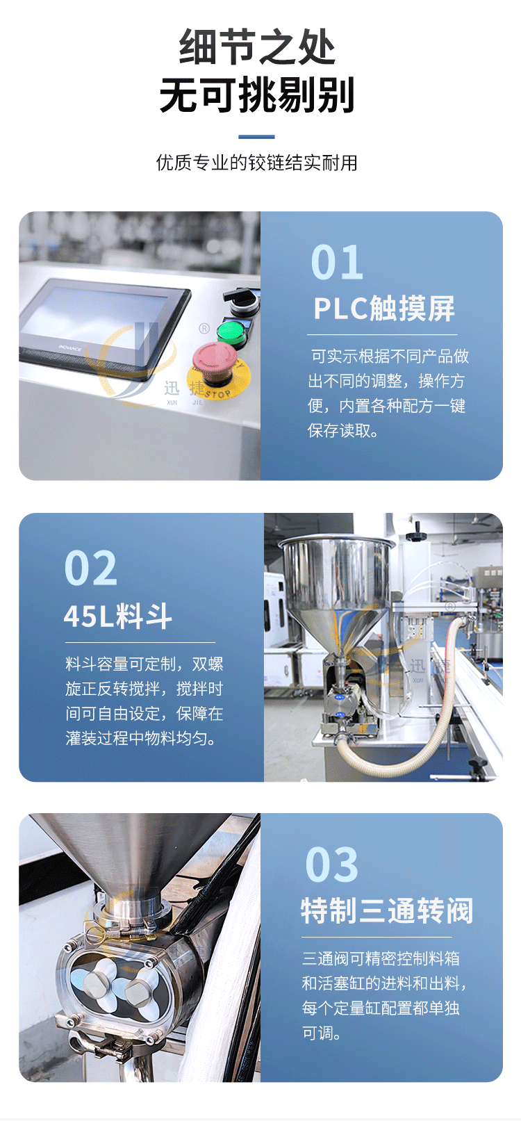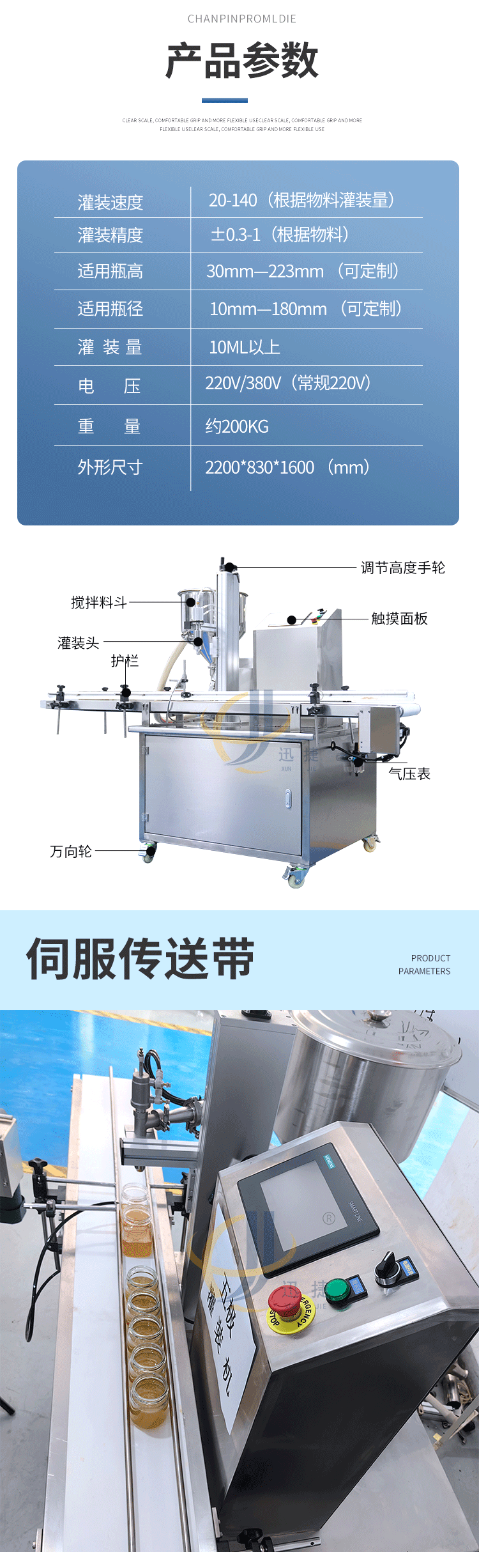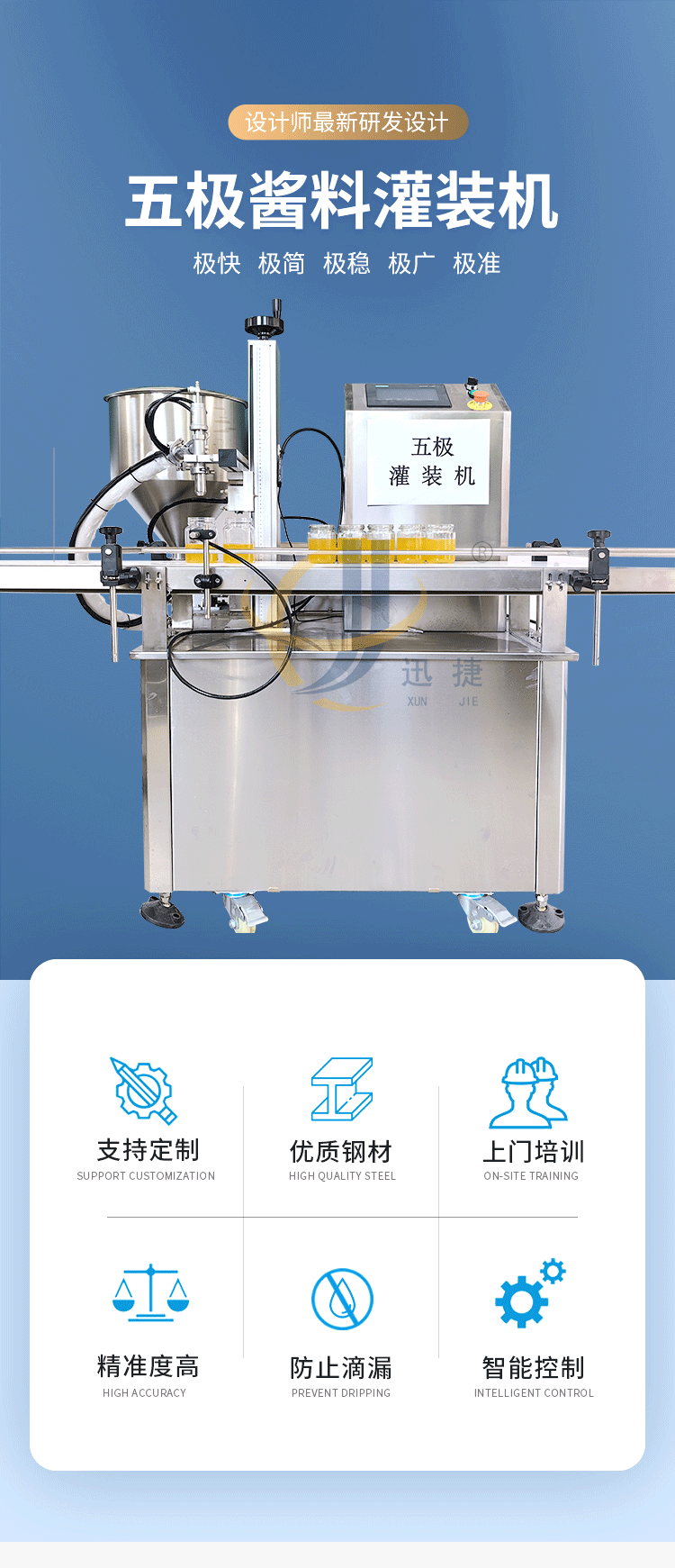 五極(jí)灌裝機(jī):極快-單頭2200瓶/時 極(jí)簡-操作簡單 極廣-啥啥(shá)都能灌 極穩-24小時不停(tíng)機 極準-200g誤差小於1g。