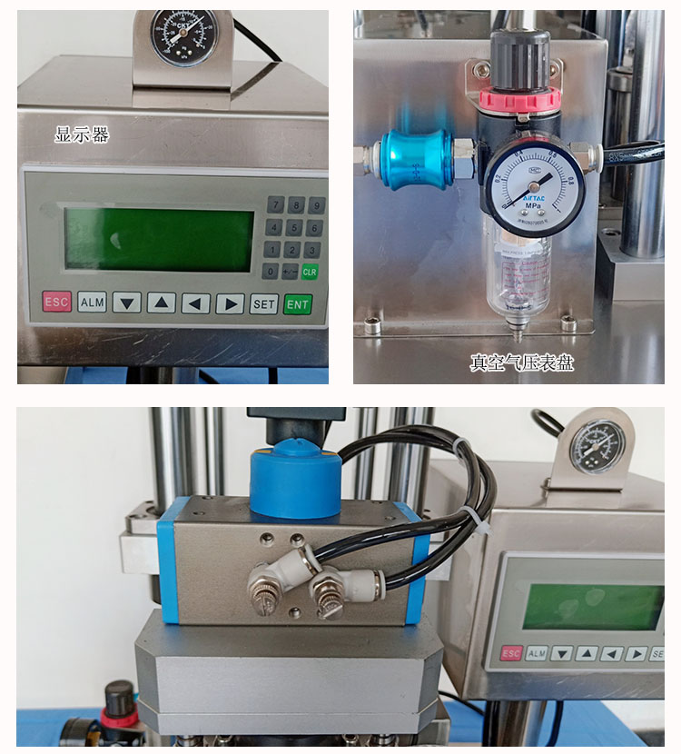 3、半自動蜂蜜真空旋蓋機通過更換少量部件,能(néng)適用於形狀、尺寸不同瓶子的(de)真空旋蓋;