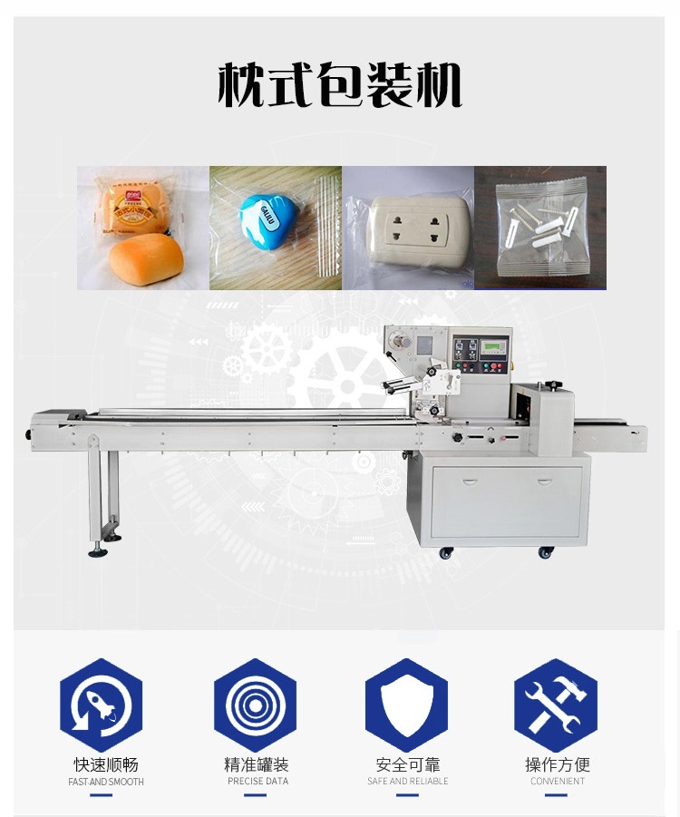 枕式包裝機可(kě)用於餅幹、月(yuè)餅、蛋黃派、米餅、雪糕、方(fāng)便麵、巧克力等塊狀產品的(de)包裝,特別適合於(yú)小批量單一產品的包裝(zhuāng)。