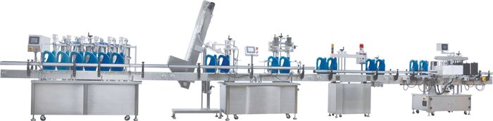 灌裝機+提蓋理蓋機+旋蓋機+鋁箔封口(kǒu)機+貼標機