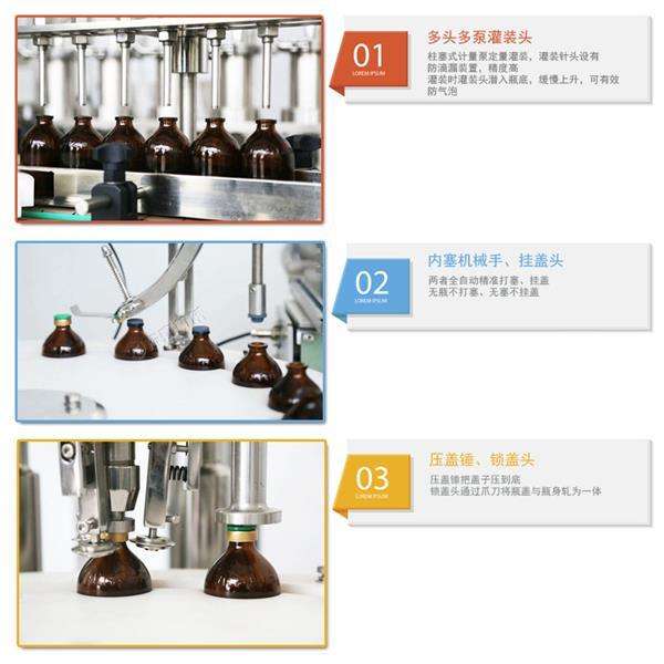 2.     穩定精準快速:柱塞式計量泵定量灌裝,灌裝針頭設有防滴漏(lòu)裝(zhuāng)置,精度(dù)高。每分鍾(zhōng)可灌裝40-60瓶。